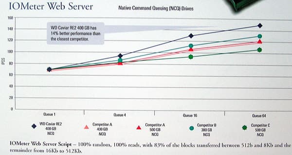 В отличие от WD4000KD с проблемным NCQ накопители WD4000YR предназначены совсем для других задач, поэтому в них NCQ не отключена, а наоборот, даже может быть полезна. Для иллюстрации «крутизны» своего диска здесь WD предлагает результаты тестов в паттернах File Server и Web Server программы IOMeter. Тестовая система состояла из Dual Intel Xeon на шасси Supermicro SC942 с 2 Гбайт буферизованной ECC-памяти Crucial, загрузочного диска WD740GD и контроллера LSI Logic MeraRAID 300-8x под управлением MS Windows Server 2003 Advanced SP1. В «компетиторах» на рисунках легко угадываются: