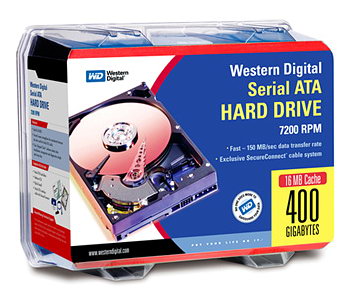 Сперва WD объявила о выпуске накопителей для настольных компьютеров ёмкостью 400 Гбайт с интерфейсом Serial ATA — WD Caviar SE16 WD4000KD с буфером 16 Мбайт. По сути, они продолжают линейку дисков WD3200JD на 107-гигабайтных пластинах, принципиально отличаясь от предшественников лишь по трем пунктам: использованием четырех пластин вместо трех, вдвое возросшим буфером данных, о чем говорит буква K в названии модели, и новым контроллером с декларируемой поддержкой NCQ (хотя, на самом деле, здесь есть свои нюансы). Данные диски не поддерживают скорость интерфейса 3 Гбит/с, как вышедшие примерно в то же время WD2500JS,