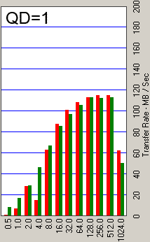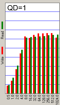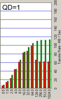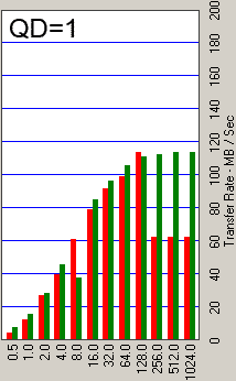 Теперь запасемся валидолом и перейдем к записи (красные столбики на диаграммах; их цвет как нельзя лучше отражает нашу тревогу). :) Сначала взглянем на наиболее чистый случай, когда NCQ отключена — это правая колонка скриншотов. Самые крупные файлы (32 Мбайт) записываются практически с такой же скоростью, как и читаются, а несколько меньшая скорость работы на самых мелких блоках при единичной глубине очереди (по сравнению с QD=4 и 9) легко объясняется кэширующим действием микропрограммы самого диска и, возможно, применяемого контроллера. Пока все хорошо, а высокая скорость работы с мелкими блоками у данного диска не может не радовать.