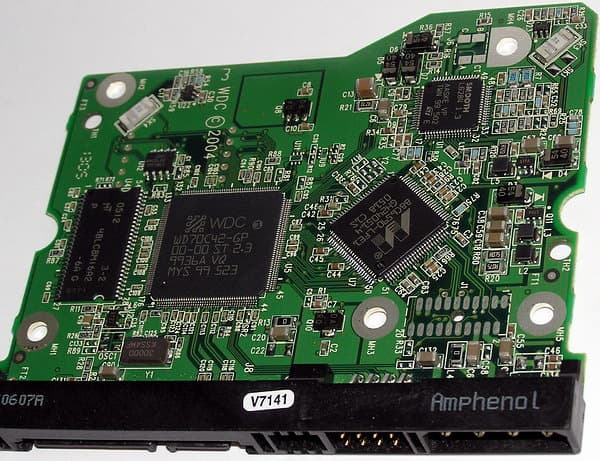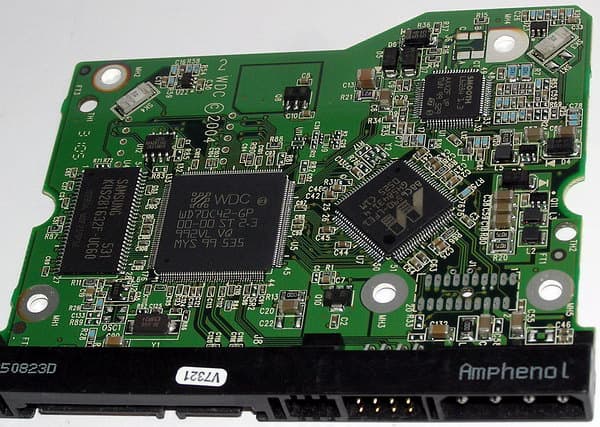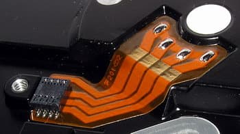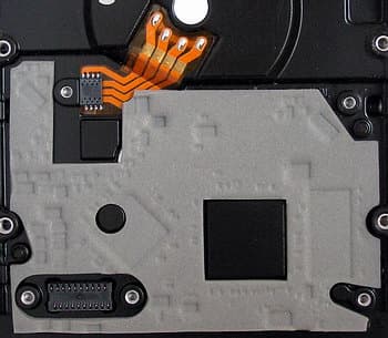 На последней фотографии, кстати, можно видеть еще один важный радиоэлемент: это датчик ускорения (в верхнем левом углу на фото). У наших героев их по 2 — в разных углах платы (тогда как у их предшественников на плате расположен только один такой датчик), и они служат для того, чтобы определять вибрацию накопителей во время работы и позволять контроллеру оперативно компенсировать паразитные микроперемещения/микроускорения кронштейна с головками, вызванные этими вибрациями. То есть позволять более быстро и точно попадать на нужную дорожку даже в условиях повышенной вибрации. Эта технология у WD имеет название RAFF (Rotary Acceleration Feed Forward).
