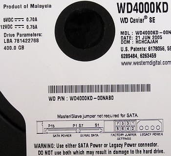 Таким образом, 3 Гбит/с в этих двух дисках WD искать не стоит. :) Зато эта скорость интерфейса появляется во всех остальных жестких дисках серий Caviar SE16 и Caviar RE2 (см. таблицу 1). И уже в тех дисках появляется наклейка на корпусе, как можно переключить скорость интерфейса между 1,5 и 3 Гбит/с. Для WD4000KD и WD4000YR джамперами на интерфейсном торце корпуса можно менять только SSC (размывание частотного спектра) и PM2 (управление электропитанием):