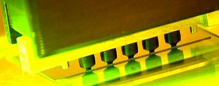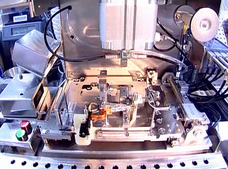После этого на подвеску монтируется (путем «бомбардировки» золотыми шариками) крохотная электрическая схема предусилителя магнитной головки