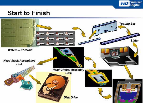 Сперва на «микроэлектронной» фабрике производятся пластины с рисунками головок чтения/записи (аналогично чипам с транзисторами). Затем эти пластины разрезаются на полоски, из которых после дополнительной обработки и резки получаются индивидуальные пары головок. Эти головки монтируются на гибких упругих подвесках вместе с электропроводкой и предусилителями, после чего индивидуальные подвески (HGA) собираются в пакеты (HSA) с общим электромагнитным приводом (VCM). Далее все просто: блоки HSA (кронштейны с головками), круглые пластины с магнитным и защитным покрытиями, а также сопутствующая электромеханика помещается в корпус диска и он закрывается. Диск оснащается платой контроллера, проходит полный цикл проверки функционирования, пакуется и отгружается на склад.