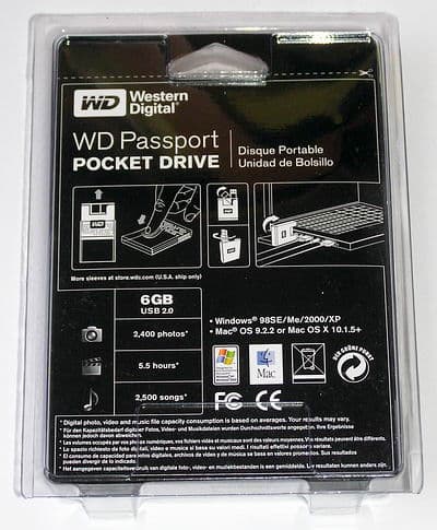 Поставляется WD Passport Pocket Drive в «одноразовой» прозрачной пластиковой упаковке с красноречивыми надписями с обратной стороны. В комплекте поставки кроме самого дивайса и резинового чехольчика к нему (кстати, доступного на сайте WD за отдельные $19,99) содержится лишь многоязычное руководство по быстрой установке. Производителем заявлена совместимость дивайса с операционными системами Windows 98SE/Me/2000/XP, MacOS 9.2.2, MacOS X 10.2.8 и более поздними. Для старых операционок (вроде Windows 98SE) драйверов в комплекте поставки не предусмотрено, хотя исходно накопитель отформатирован на FAT32. Впрочем, мануал рекомендует сходить за этими драйверами на сайт поддержки WD (ответ ID 1286 в Knowlodge Base).