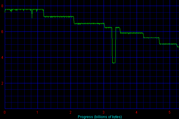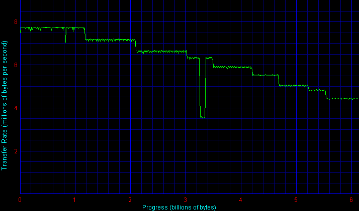 Здесь видно, что линейная скорость чтения у нашего героя немного не дотягивает до 8 млн. байт/с. Притом, что у того же однодюймового накопителя Seagate емкостью 5 Гбайт, выпущенного 2 года назад, средняя скорость линейного чтения была даже немного выше (см. следующий график).