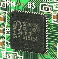 Сердцем контроллера-преобразователя интерфейсов служит микросхема CY7C68300B, уже знакомая нам по некоторым 2,5-дюймовым USB-винчестерам (например, WD Passport 120 Гбайт). Данный контроллер имеет достаточно высокое быстродействие и, по идее, не должен быть узким местом в цепи передачи сигнала.