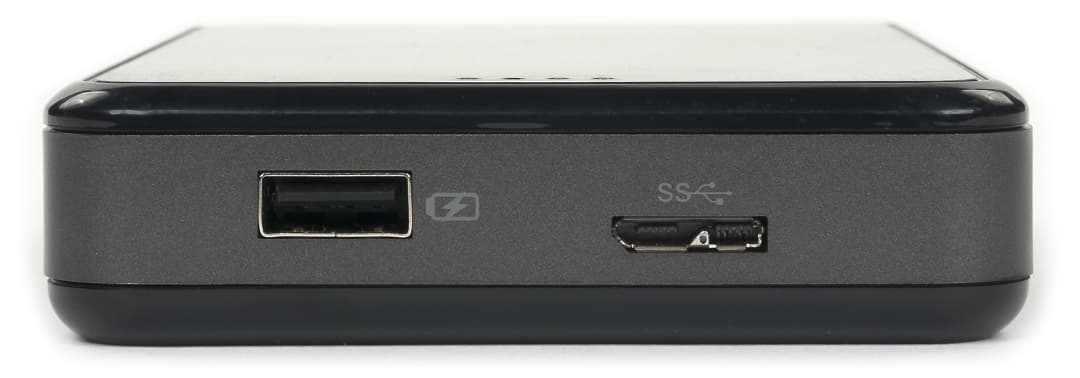 Разъем интерфейса USB 3.0 (формата микро), обеспечивающий обмен данными и зарядку встроенного аккумулятора, и выход USB для подзарядки мобильных устройств находятся на коротком торце.
