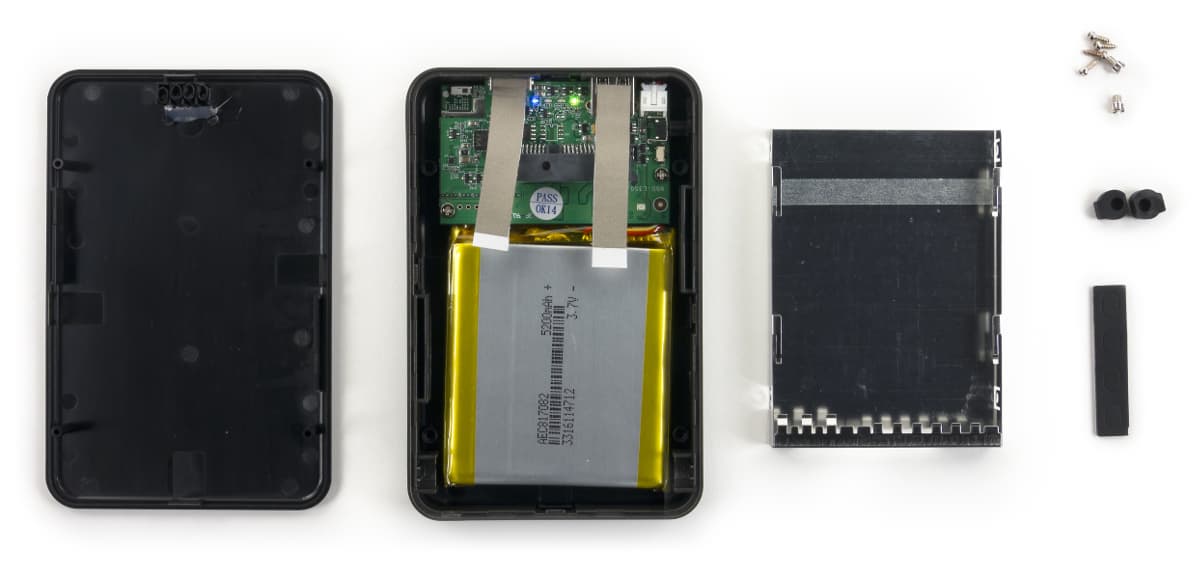 Комплект поставки, по понятной причине, достаточно большой: корпус накопителя с установленной в нем печатной платой и аккумуляторной батареей, кабель Micro-USB 3.0 длиной 60 см, мешочек для транспортировки из ткани, инструкция по сборке и использованию на нескольких языках, включая русский), комплект крепежа и крестовая отвертка.