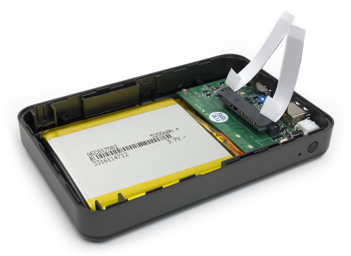 В этот раз мы имеем возможность официально заглянуть внутрь корпуса накопителя. Больше всего места (если не считать винчестера) здесь занимает аккумуляторная батарея, имеющая емкость 5200 мА·ч при 3,7 В. Она приклеена к нижней части корпуса, но формально может быть заменена. Производитель говорит о возможности ее использования не только для питания накопителя, но и для восполнения заряда мобильных устройств.