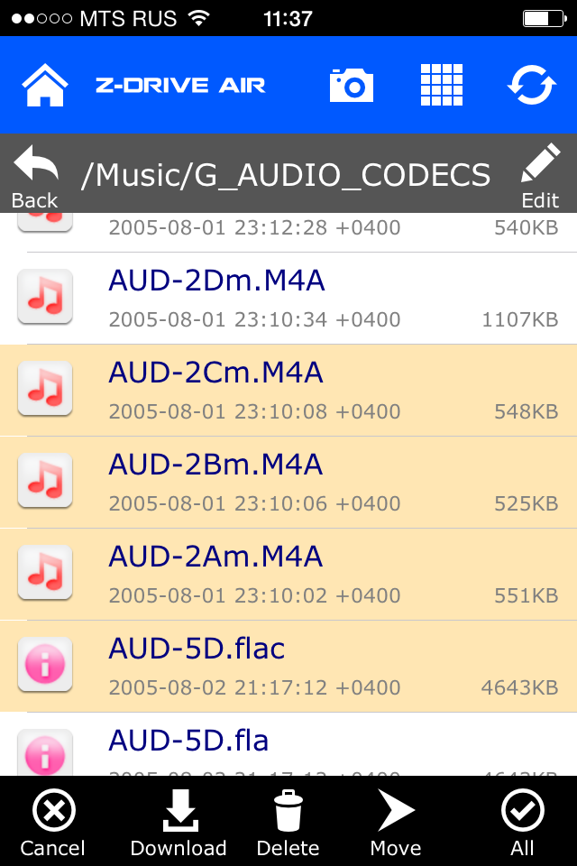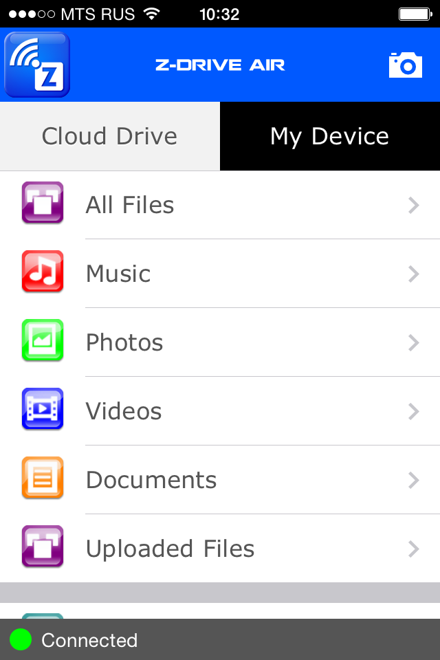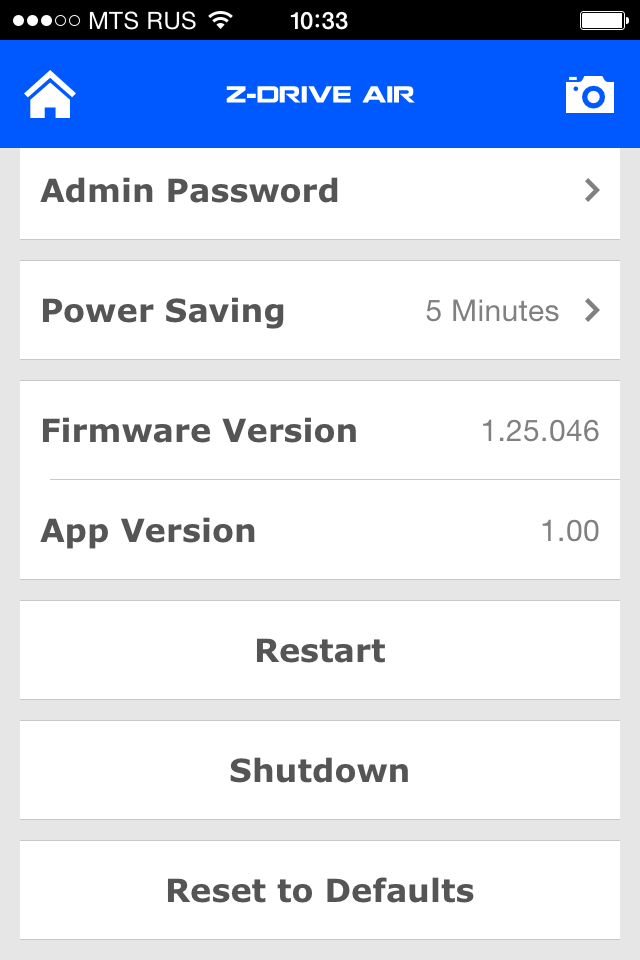 Устройства с iOS способны работать только с указанными в таблице форматами мультимедиа. Даже если закачать файл на смартфон или планшет, открыть его в другой программе не получится, такой возможности просто не предусмотрено в Z-Drive Air. Так что для неподдерживаемых форматов остается только вариант работы с DLNA-клиентом. Что касается работы с камерой, то для iOS также заявлена возможность делать фотографии и снимать видео с загрузкой на накопитель. С тестовым смартфоном под управлением последней версии iOS эта функция не работала (программа «вылетала»). Но загрузить фотографии и видео из фотогалереи на диск получилось.