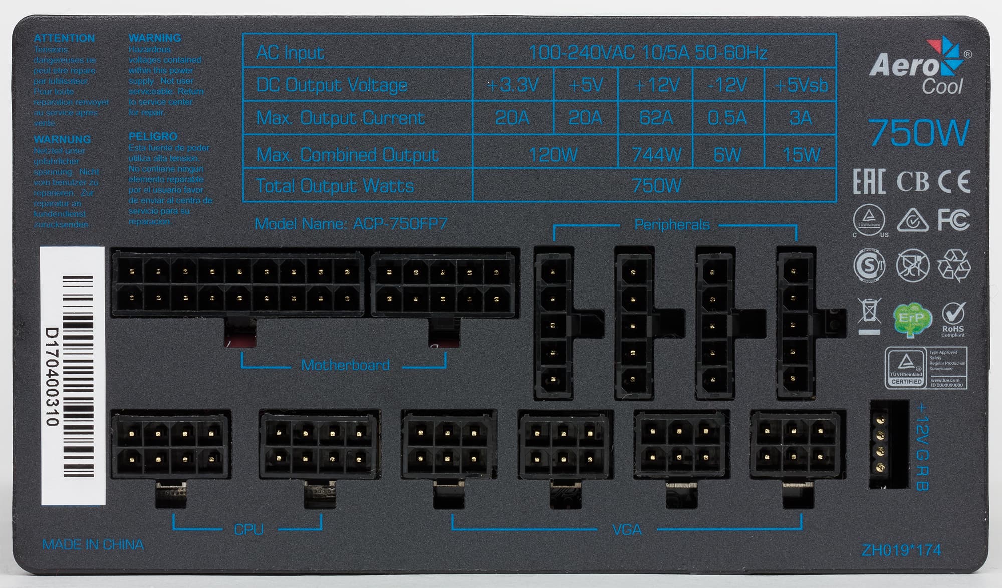 Из интересных моментов стоит упомянуть наличие RGB-подсветки, которая будет работать только при использовании системной платы с поддержкой данной функции или хаба-контроллера Aerocool P7-H1, который в розничный комплект поставки БП не входит (им комплектуется корпус Aerocool P7-C0 Pro, рассмотренный нами ранее).