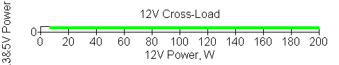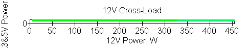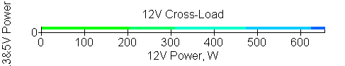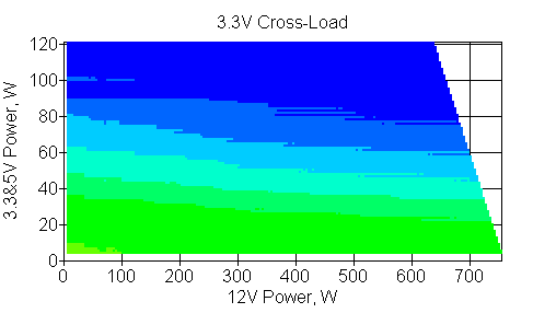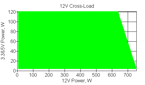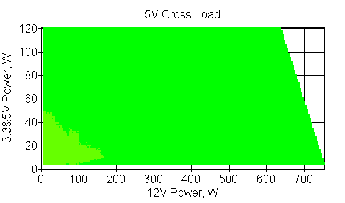 Следующим этапом инструментального тестирования является построение кросснагрузочной характеристики (КНХ) и представление ее на четвертьплоскости, ограниченной максимальной мощностью по шине 3,3&5 В с одной стороны (по оси ординат) и максимальной мощностью по шине 12 В с другой (по оси абсцисс). В каждой точке измеренное значение напряжения обозначается цветовым маркером в зависимости от отклонения от номинального значения.