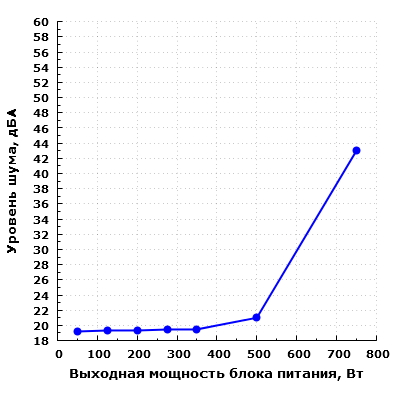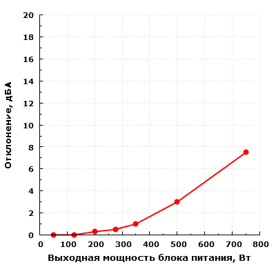При нагрузке в 750 Вт шум блока питания преодолевает эргономичный предел в 40 дБА при условии настольного размещения, то есть при расположении блока питания в ближнем поле по отношению к пользователю. Подобный уровень шума можно охарактеризовать как достаточно высокий.