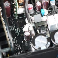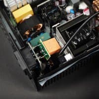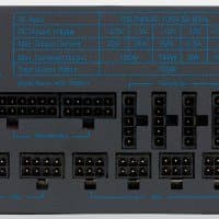 Полупроводниковые элементы высоковольтных цепей размещены на радиаторе средних размеров. Элементы синхронного выпрямителя размещены на обратной стороне печатной платы и охлаждаются именно за счет последней (на лицевой стороне платы установлен теплоотвод). Независимые источники +3.3VDC и 5VDC установлены на дочерних печатных платах и, по традиции, дополнительных теплоотводов не имеют — это вполне типично для блоков питания с активным охлаждением.