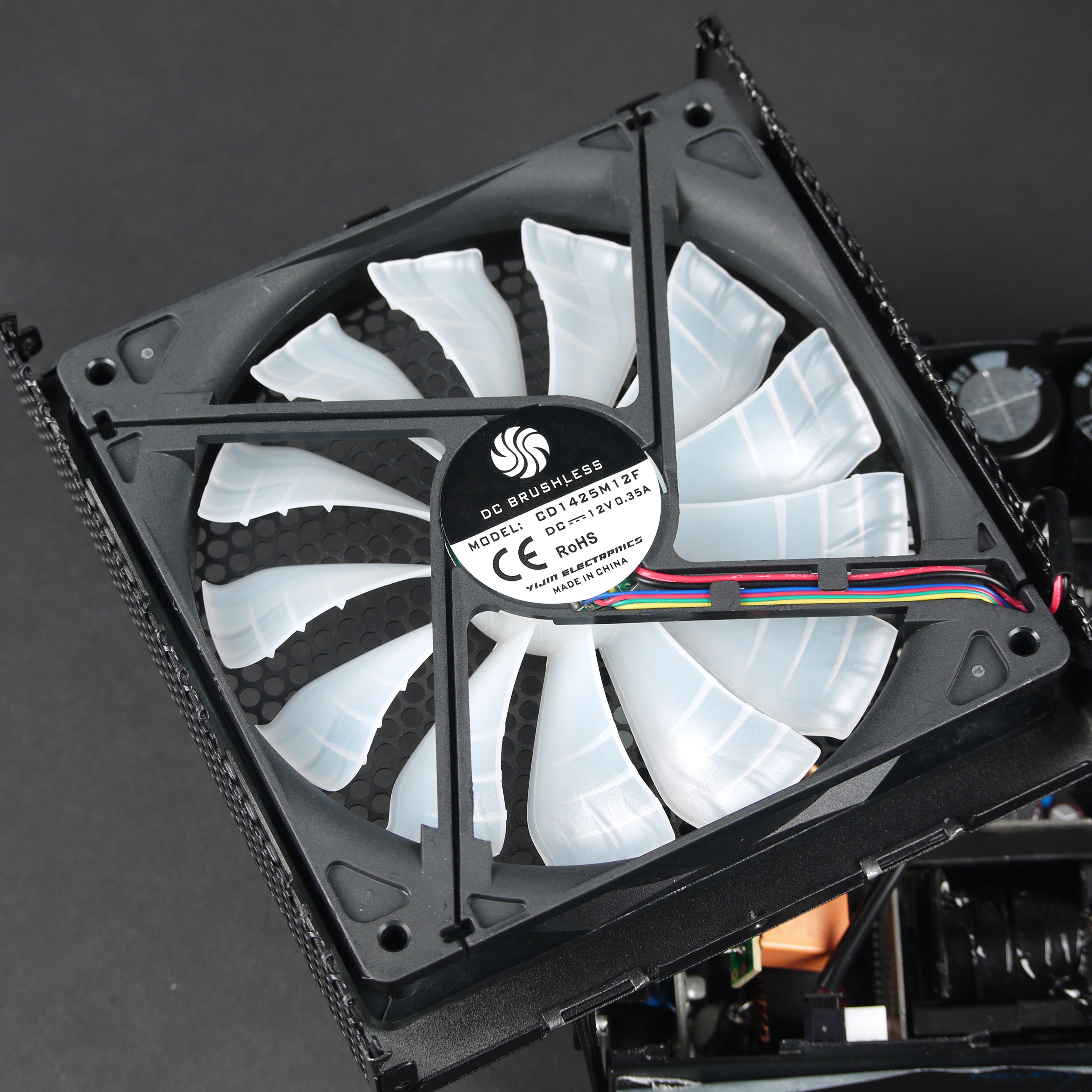 В блоке питания установлен 140-миллиметровый вентилятор CD1425M12F производства компании Yijin Electronics. Найти информацию про Yijin Electronics нам не удалось, но Aerocool заявляет о применении в данном вентиляторе гидродинамического подшипника.