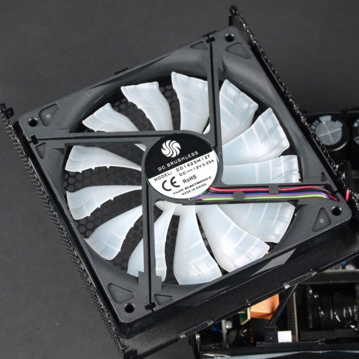Данная модель имеет гибридную систему охлаждения, что означает возможность функционирования БП не только при активном, но и при пассивном охлаждении. Управление запуском вентилятора производится в зависимости от температуры на термодатчике.