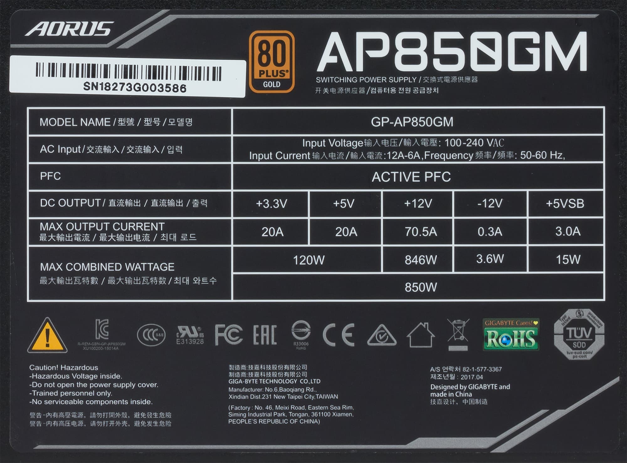 Все необходимые параметры указаны на корпусе блока питания в полном объеме, для мощности шины +12VDC заявлено значение 846 Вт. Соотношение мощности по шине +12VDC и полной мощности составляет 0,995, что является отличным показателем.