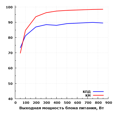 Эффективность БП находится на достойном уровне. Согласно нашим измерениям, КПД данного блока питания достигает значения свыше 88% в диапазоне мощности от 300 до 850 ватт. Максимальное зарегистрированное значение составило около 90% на мощности 750 Вт. Одновременно с этим, КПД на мощности 50 Вт составил 73,2%.