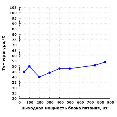Стоит учитывать, что при повышении температуры окружающего воздуха заметно возрастает шум электроники БП. Именно из-за этого наблюдается рост уровня шума на мощности 100 Вт, так как вентилятор при этом не вращается.