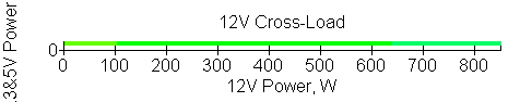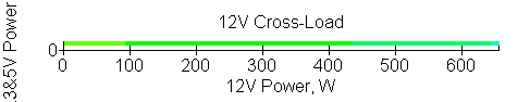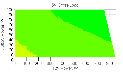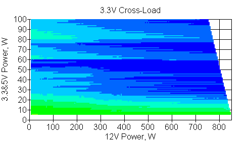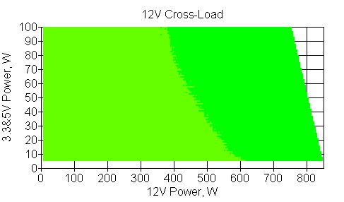 Следующим этапом инструментального тестирования является построение кросснагрузочной характеристики (КНХ) и представление ее на четвертьплоскости, ограниченной максимальной мощностью по шине 3,3&5 В с одной стороны (по оси ординат) и максимальной мощностью по шине 12 В с другой (по оси абсцисс). В каждой точке измеренное значение напряжения обозначается цветовым маркером в зависимости от отклонения от номинального значения.