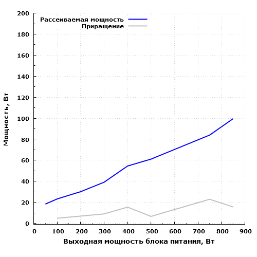 Экономичность модели находится на очень хорошем уровне: на максимальной мощности БП рассеивает около 99,6 Вт, 60 Вт он рассеивает на мощности порядка 500 Вт. На мощности 50 Вт блок питания рассеивает около 18,3 Вт.
