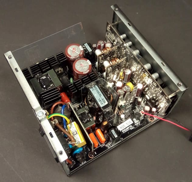 Полупроводниковые элементы высоковольтных цепей размещены на радиаторе средних размеров. Транзисторы синхронного выпрямителя канала +12VDC установлены на небольших теплоотводах. Независимые источники +3.3VDC и 5VDC установлены на дочерних печатных платах и, по традиции, дополнительных теплоотводов не имеют — это вполне типично для блоков питания с активным охлаждением.
