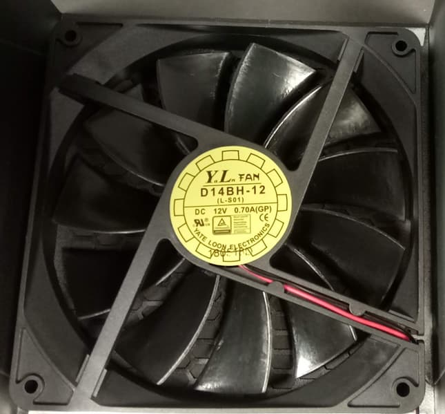 Для охлаждения БП используется вентилятор компании Yate Loon Electronics — D14BH-12 типоразмера 140 мм (125 мм между центрами крепежных отверстий), имеющий, по данным производителя, максимальную скорость вращения 2800 оборотов в минуту. Вентилятор основан на подшипнике качения, что должно положительно сказаться на сроке его службы.