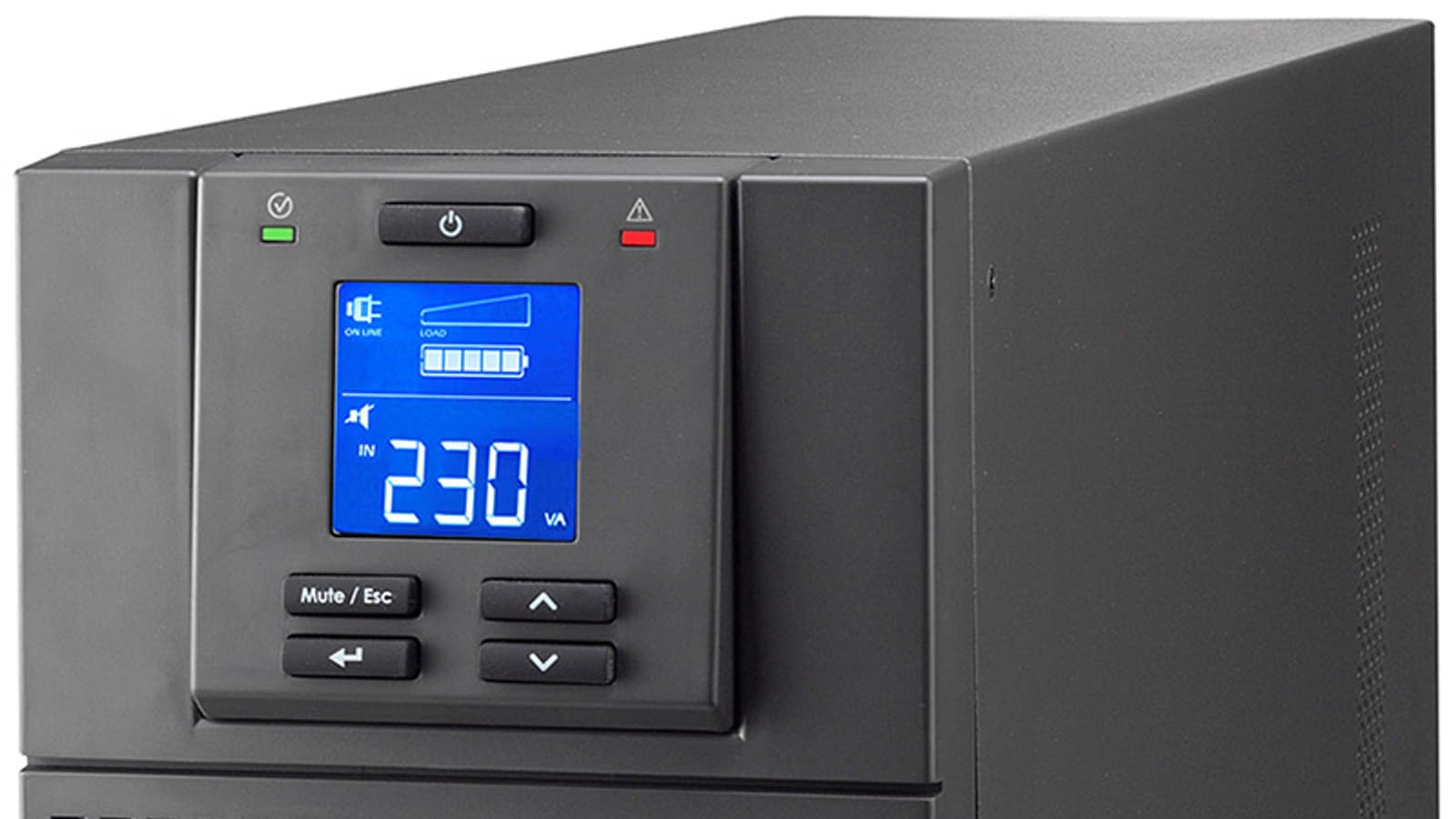 Кнопки приятные на ощупь, но работать с ними неудобно: свободный ход велик, а срабатывание не всегда происходит с первого нажатия. Кроме того, пользоваться кнопками и наблюдать за экраном, если ИБП расположен на полу или на низкой подставке, будет затруднительно, хотя углы обзора как по горизонтали, так и по вертикали очень приличные.