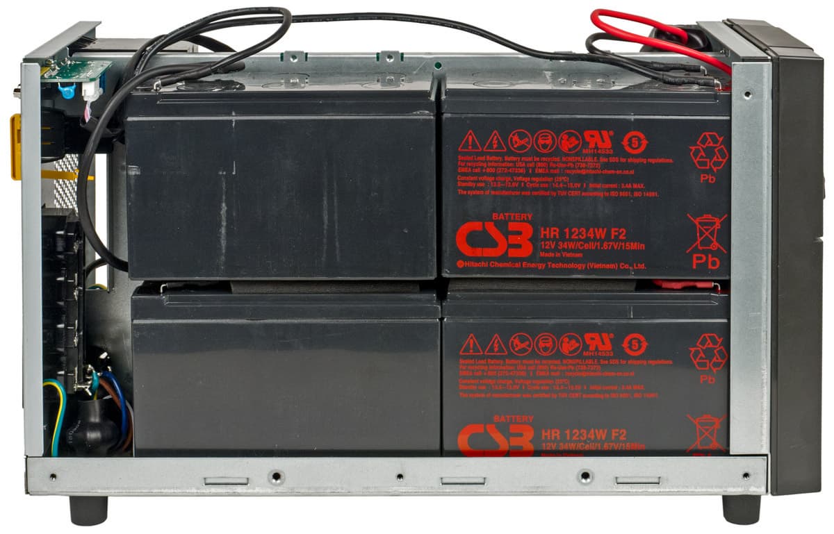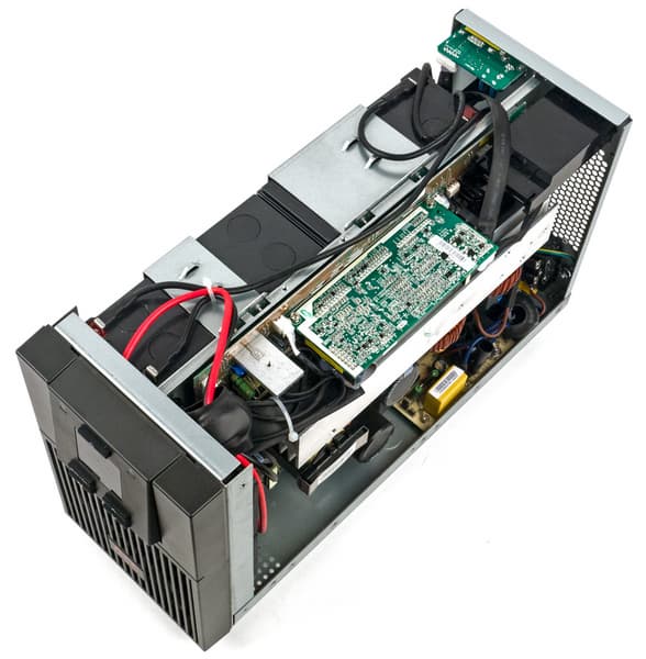 По понятным причинам большого и тяжелого низкочастотного трансформатора в данном ИБП нет, поэтому вес в значительной степени определяется батареями.