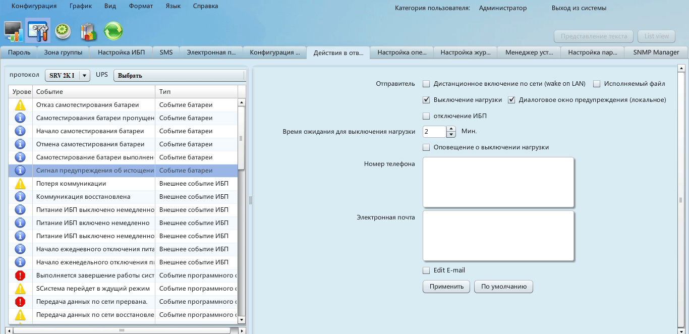 Очевидно, отображаемые настройки являются общими для ИБП из разных серий, поэтому для конкретной модели какие-то из них могут и не работать. С некоторыми из установок не все понятно: как мы уже отмечали, с панели управления отключить звуковую сигнализацию заблаговременно нельзя, можно лишь «погасить» звуковые сигналы, когда они уже зазвучали; можно ожидать того же и при управлении из программы, и действительно: попытка отключить отсутствующие сигналы не удается — выдается сообщение об ошибке, но когда сигналы уже звучат, команда на их отключение вроде бы проходит нормально, однако через некоторое время звуки возобновляются.