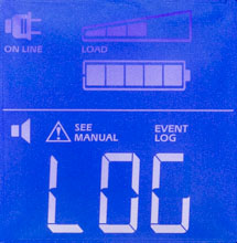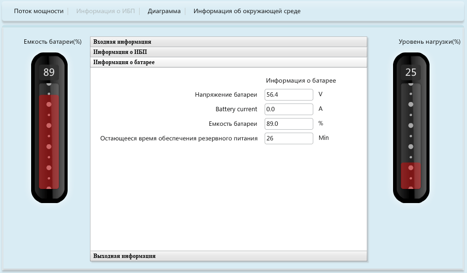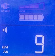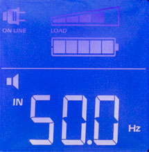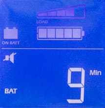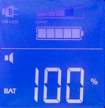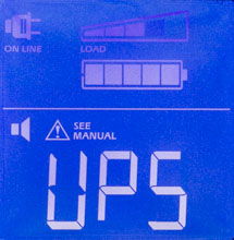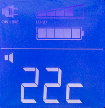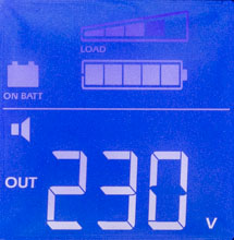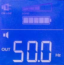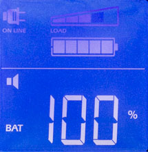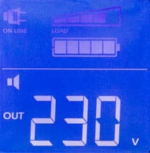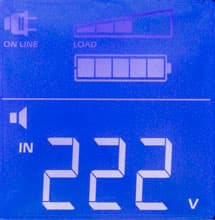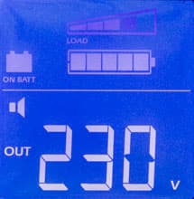 - цифровые значения для величины и частоты входного и выходного напряжений, мощности нагрузки (в вольт-амперах и в процентах от максимума), уровня заряда батареи и ожидаемого при текущем потреблении времени автономной работы, напряжения на батарее и температуры внутри корпуса,