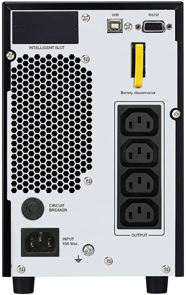 На задней стенке находятся четыре выходные розетки IEC C13 с батарейной поддержкой, гнездо для подключения кабеля питания и шток входного автоматического предохранителя. Там же находятся и слаботочные коннекторы — порты USB типа B и RS232 для подключения ИБП к компьютеру с целью управления и мониторинга.