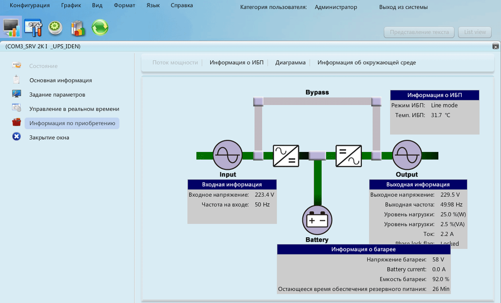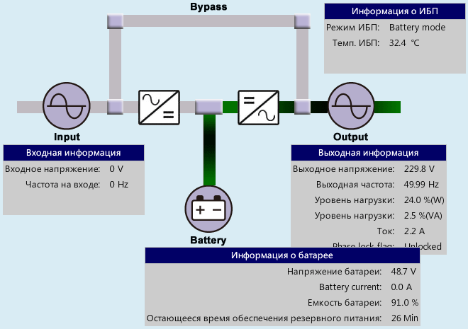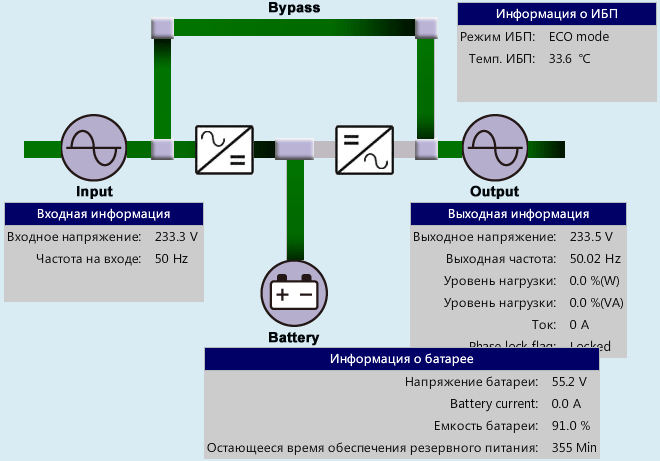 Информацию о состоянии ИБП и происходящих процессах можно наглядно отобразить в виде схемы потоков мощности: