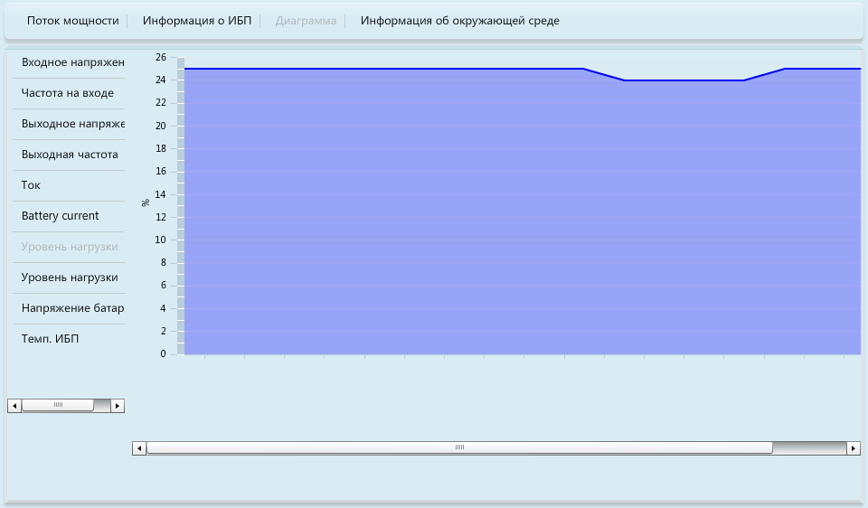 Правда, здесь не все однозначно. Например, ток батареи (почему-то название этого параметра не переведено на русский язык) все время остается равным нулю — и при разряде, и во время заряда. Нагрузку мы подключили резистивную, однако отображаемые значения уровней нагрузки в ваттах и вольт-амперах отличаются на порядок, хотя должны быть одинаковыми.