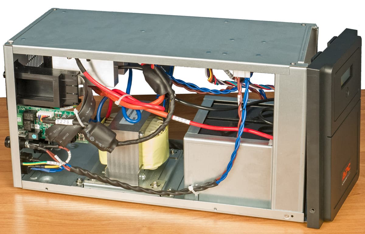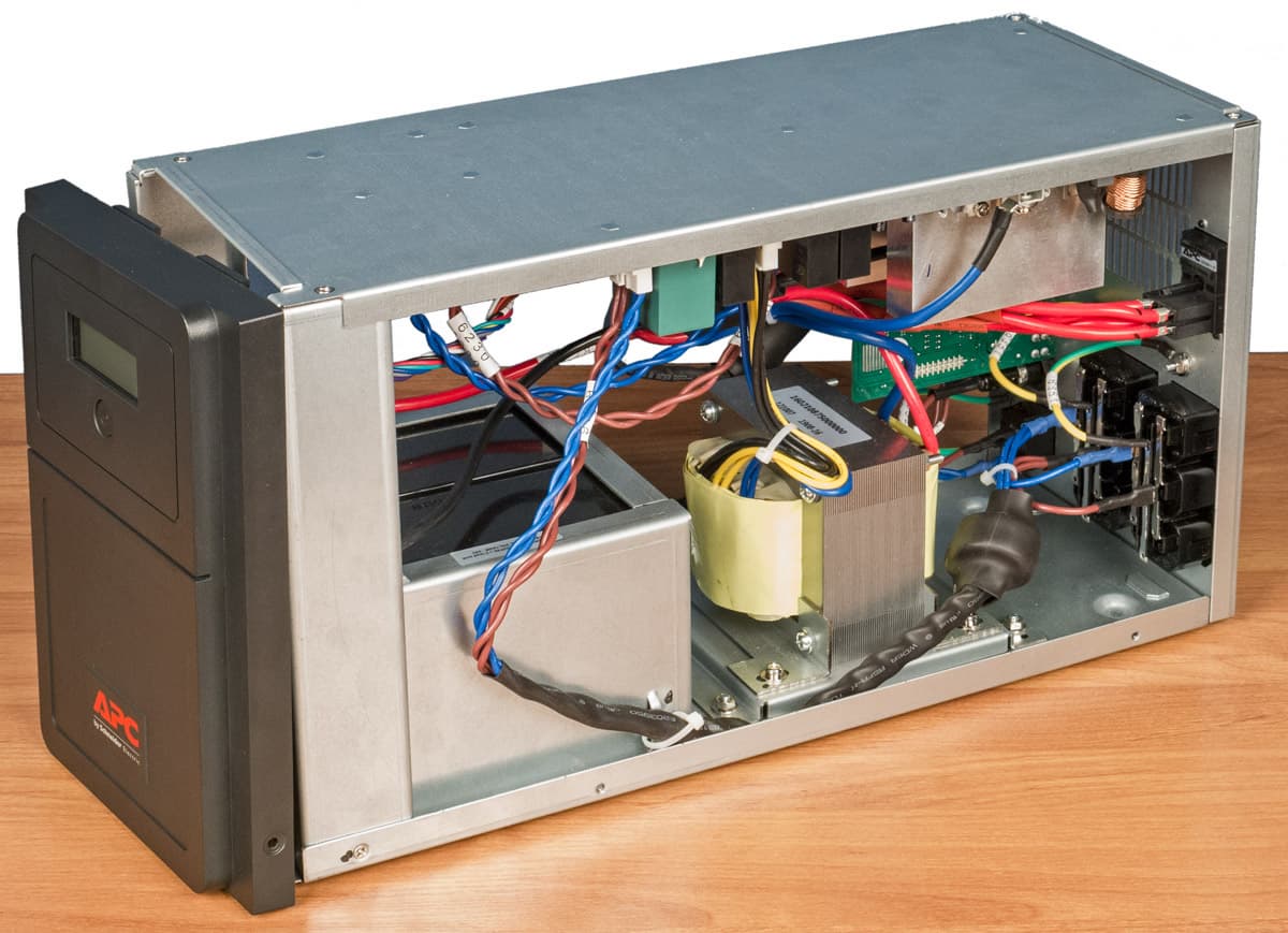 По бокам решетки имеются закрытое крышечкой гнездо SmartSlot для подключения дополнительных модулей, расширяющих возможности использования, управления и мониторинга ИБП, а также перемычка, замыкающая цепь батареи — при длительной транспортировке или во время хранения источника ее следует извлечь.