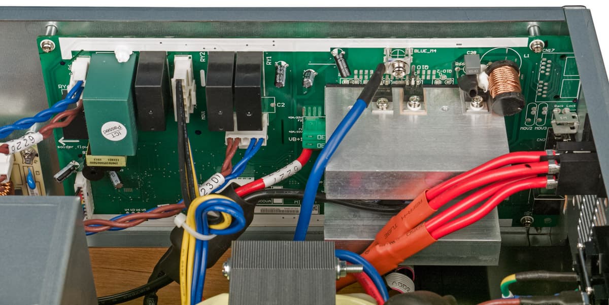 На «потолке» размещена плата с электронными компонентами. Мощные транзисторы инвертора и другие компоненты, имеющие значительный нагрев, закреплены на двух алюминиевых радиаторах в виде брусков без каких-либо проточек или ребер.