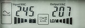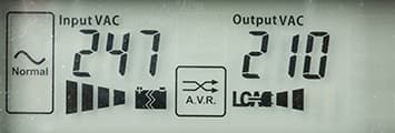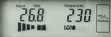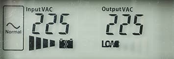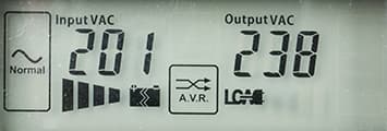 - цифровые значения: при работе от сети — для входного и выходного напряжений, в автономном режиме — для напряжений на батарее (постоянного) и на выходе (переменного),