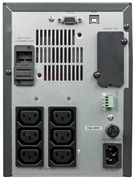 Нижнюю часть задней стенки занимают разъемы питания: входной и шесть выходных C13 (IEC320). Все выходные гнезда обеспечивают подключенные нагрузки защитой от импульсных помех и питанием от батареи (через инвертор).