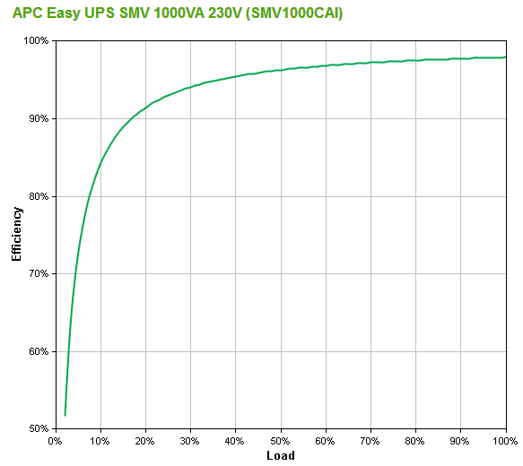 Диаграмма времени автономной работы, ссылку на которую мы привели в таблице, начинается с нагрузки в 70 Вт. Поскольку у читателей обзоров, посвященных ИБП, регулярно возникает вопрос о времени автономной работы с еще меньшими нагрузками вроде роутеров, приводим позаимствованный с официального сайта график зависимости КПД от нагрузки: