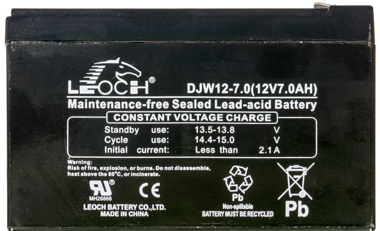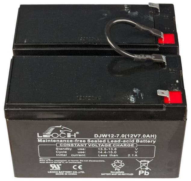 В нашем экземпляре были установлены две свинцово-кислотные аккумуляторные батареи Leoch DJW12-7.0 с заявленными напряжением 12 В и емкостью 7 А·ч, соединенные последовательно.