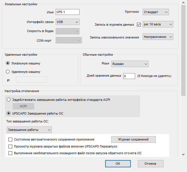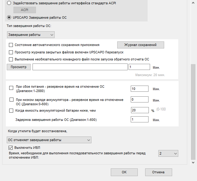 Настроек много, но они в основном связаны с вариантами завершения работы компьютера и его операционной системы при сбоях питания. Меньшая часть настроек относится к функционированию самой программы (выбор языка, ведение журнала), причем «вычеркнуть» программу из списка автозагрузки здесь нельзя, при необходимости придется пользоваться средствами Windows.
