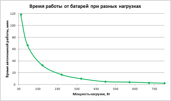 Если сравнить полученные нами результаты с приведенной на официальном сайте диаграммой, то получается следующее: для больших и средних нагрузок диаграмма дает несколько завышенные значения времени автономной работы, при этом чем меньше нагрузка, тем меньше такое завышение, и для совсем малых наблюдается практически полное совпадение.