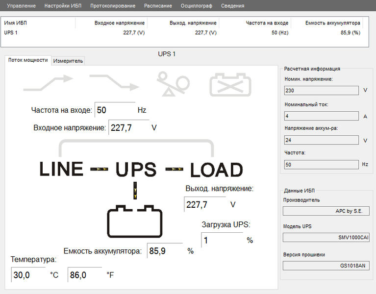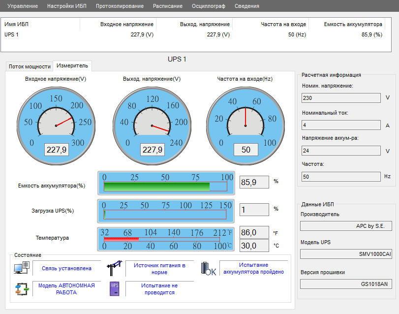 Пункт меню «Протоколирование» задает параметры журналов событий и данных, «Расписание» позволит определить проведение автоматической самодиагностики (с завершением работы ОС или без) — других настроек нет, не упоминает их и инструкция по UPSCAPO.