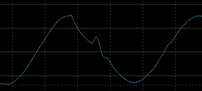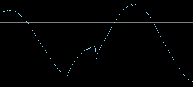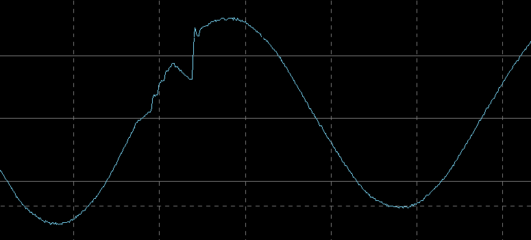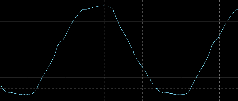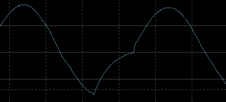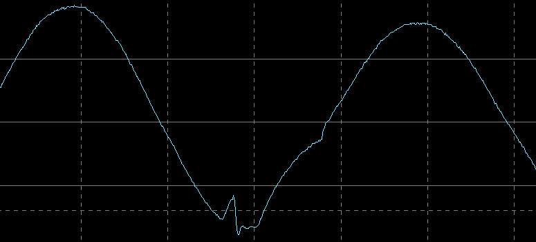 Это тоже не та кошмарная «аппроксимированная синусоида», что наблюдается у большинства линейно-интерактивных и резервных ИБП, но отличия от привычной по школьному курсу математики кривой видны сразу.