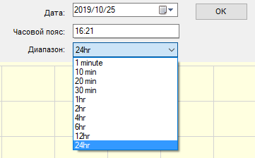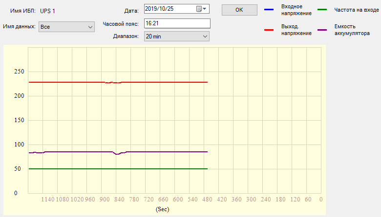 Можно выбирать отображаемые данные — все перечисленные или какой-то один параметр, задавать временной диапазон отображения от 1 минуты до 24 часов и время начала отсчета, а также выбирать дату. Все изменения — по нажатию кнопки «ОК»; если на входе и выходе напряжения одинаковые, как на приведенном скриншоте, отображается только красная линия для выходного напряжения.