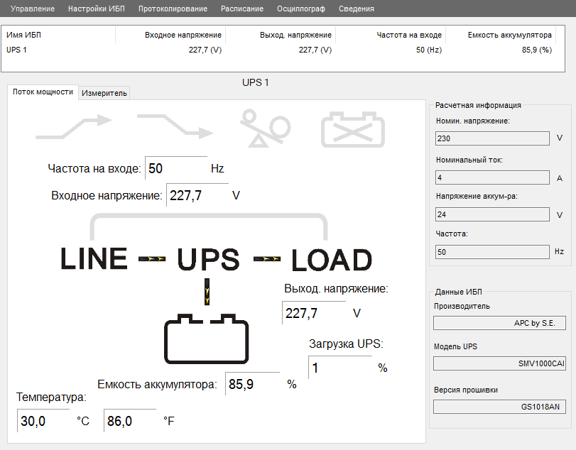 Даже при первом взгляде на окно программы уже становится интересно: оказывается, в ИБП отслеживается частота входного напряжения и температура (вероятно, по датчику внутри корпуса), с разрядностью до одного знака после запятой — напряжения на входе и выходе, емкость аккумулятора (в процентах; не очень корректное название параметра, лучше было бы написать «уровень заряда»), с разрядностью до единиц процентов — уровень загрузки (очевидно, от заявленного максимума).