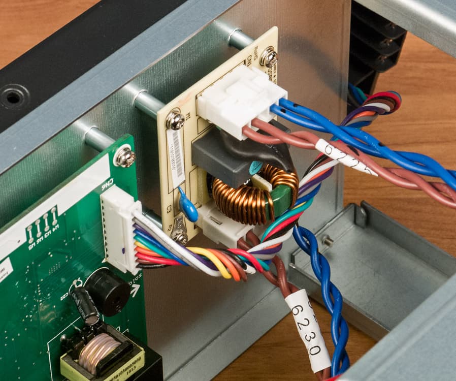 Чтобы вскрыть корпус, нужно удалить два винта сзади и по три с каждого бока, затем немного сдвинуть лицевую панель вниз, чтобы освободить зацепы на внутренней верхней части, и снять ее (отложить далеко в сторону не получится: помешает подходящий к индикатору и кнопке пучок проводов). Затем можно будет удалить и П-образную металлическую крышку.