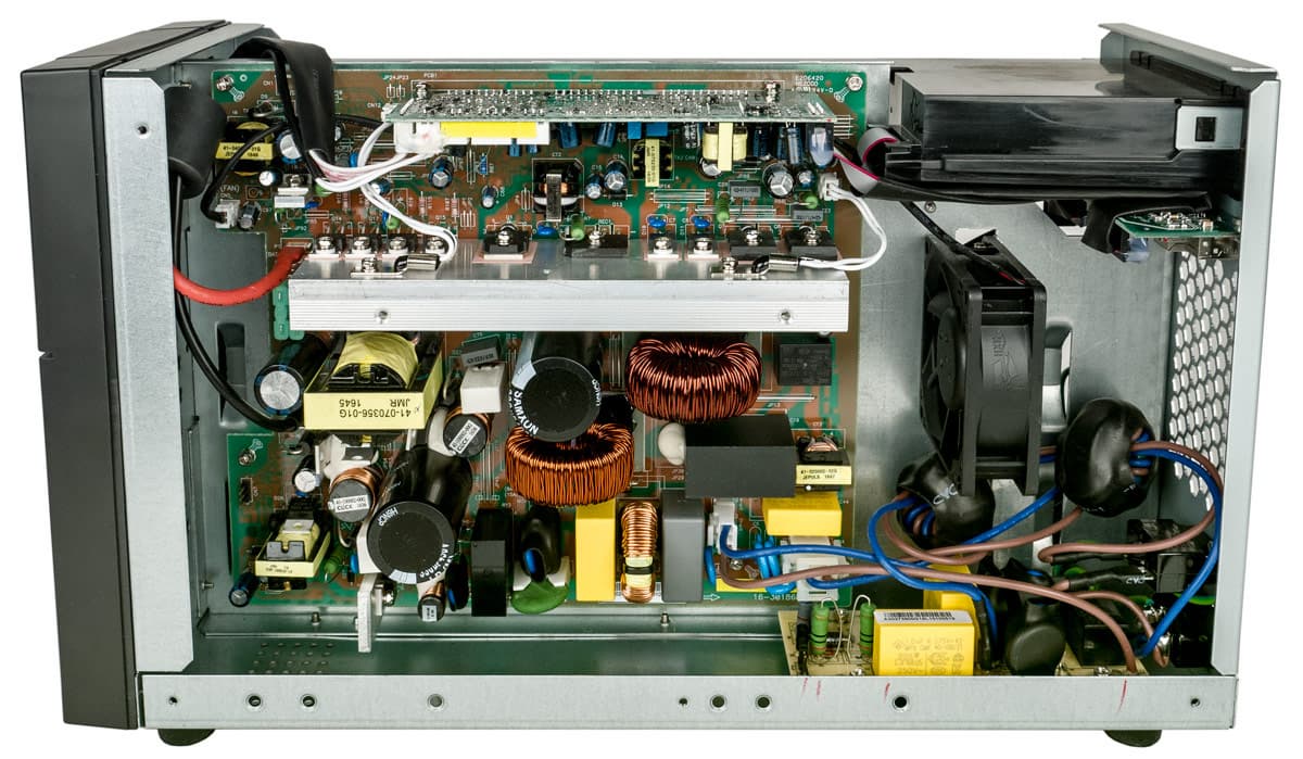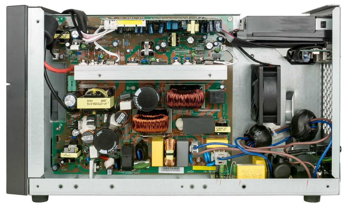 Силовые компоненты — транзисторы, диоды и выпрямительный мост — установлены на общем алюминиевом радиаторе, ребра которого ориентированы продольно, что соответствует направлению потока воздуха, создаваемого вентилятором. Температура контролируется двумя термодатчиками, закрепленными на радиаторе.
