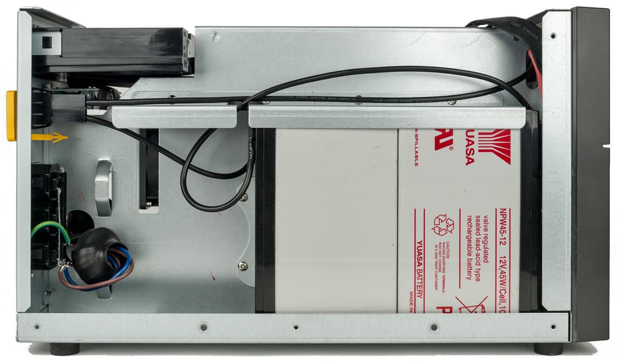 По понятным причинам большого и тяжелого низкочастотного трансформатора в данном ИБП нет, поэтому вес в значительной степени определяется батареями.