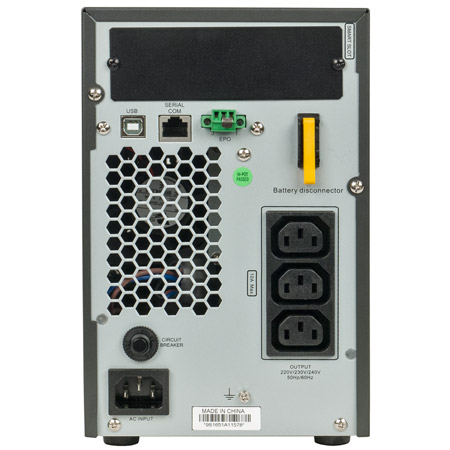 На задней стенке находятся три выходные розетки IEC C13 с батарейной поддержкой, гнездо для подключения кабеля питания и шток входного автоматического предохранителя. Там же находятся и слаботочные коннекторы — порты USB типа B и RS232 (10-контактный RJ50, иное обозначение 10P10C) для подключения ИБП к компьютеру с целью управления и мониторинга, а также порт аварийного отключения (EPO).